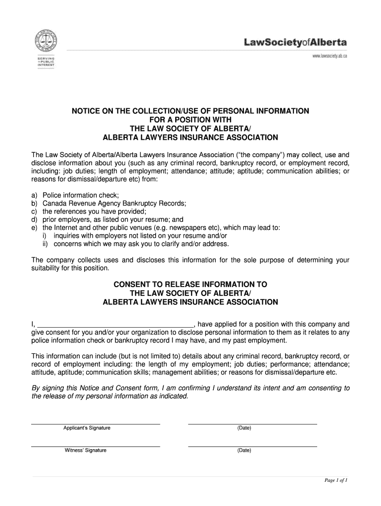 NOTICE ON THE COLLECTION/USE OF PERSONAL INFORMATION FOR A POSITION WITH THE LAW SOCIETY OF ALBERTA/ ALBERTA LAWYERS INSURANCE ASSOCIATION The Law Society of Alberta/Alberta Lawyers Insurance Association