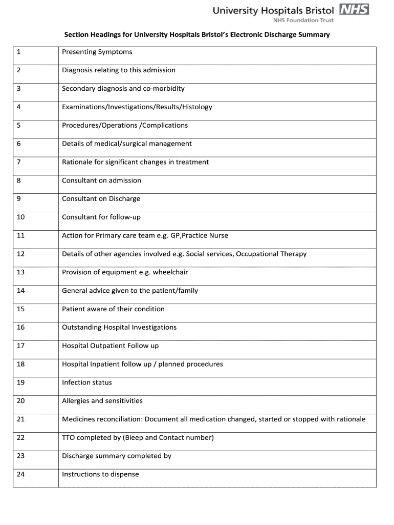 Section Headings for University Hospitals Bristol's Electronic Discharge Summary
