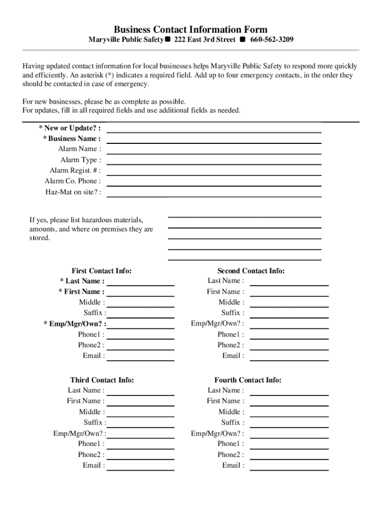 This form collects updated contact information for local businesses to help Maryville Public Safety respond more quickly and efficiently in case of emergencies. It includes fields for business details,