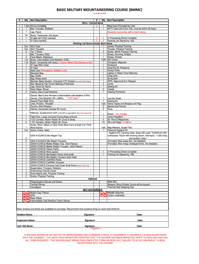 BASIC MILITARY MOUNTAINEERING COURSE (BMC) As of 28 Jun 2013 X Qty x × × 1 Set Acts Complete Belt, Trousers, Webbed 1 1 Cap, Patrol 1pr Boots, Temperate, with laces ID tags with chain (carried)