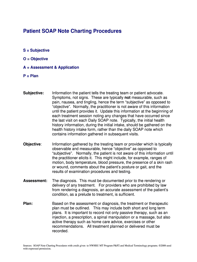 Patient SOAP Note Charting Procedures S Subjective O Objective A Assessment & Application P Plan Subjective: Information the patient tells the treating team or patient advocate. Symptoms, not signs.