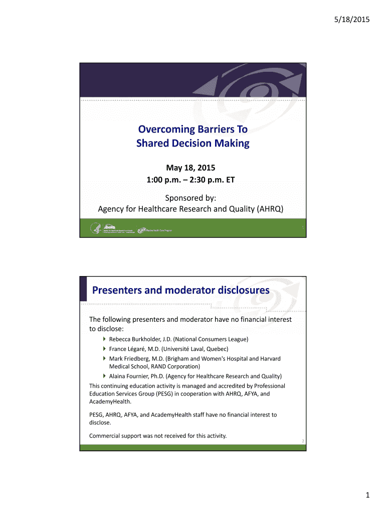 5/18/2015OvercomingBarriersTo SharedDecisionMaking May18,2015 1:00 p m 2:30p.m.ET 1:00p.m. 2:30 p m ET Sponsored by: AgencyforHealthcareResearchandQuality(AHQ) 1Presentersandmoderatordisclosures Thefollowingpresentersandmoderatorhavenofinancialinterest