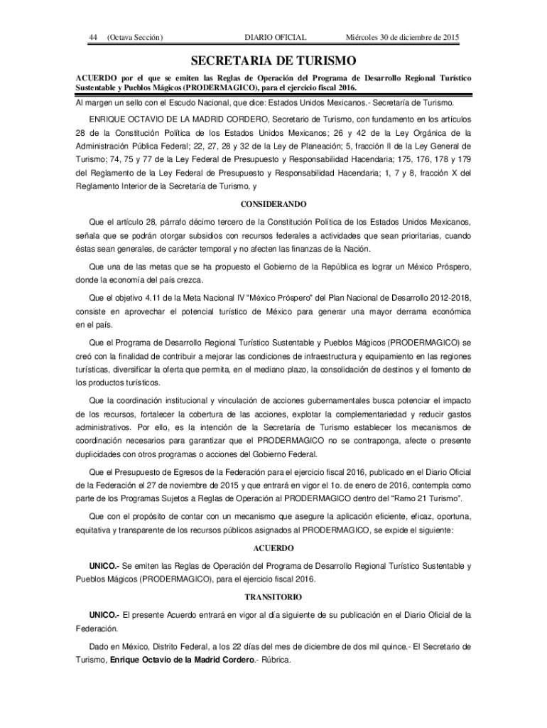 44(Octave Section)DARIO OFICIALMircoles 30 de December de 2015SECRETARIA DE TOURISM