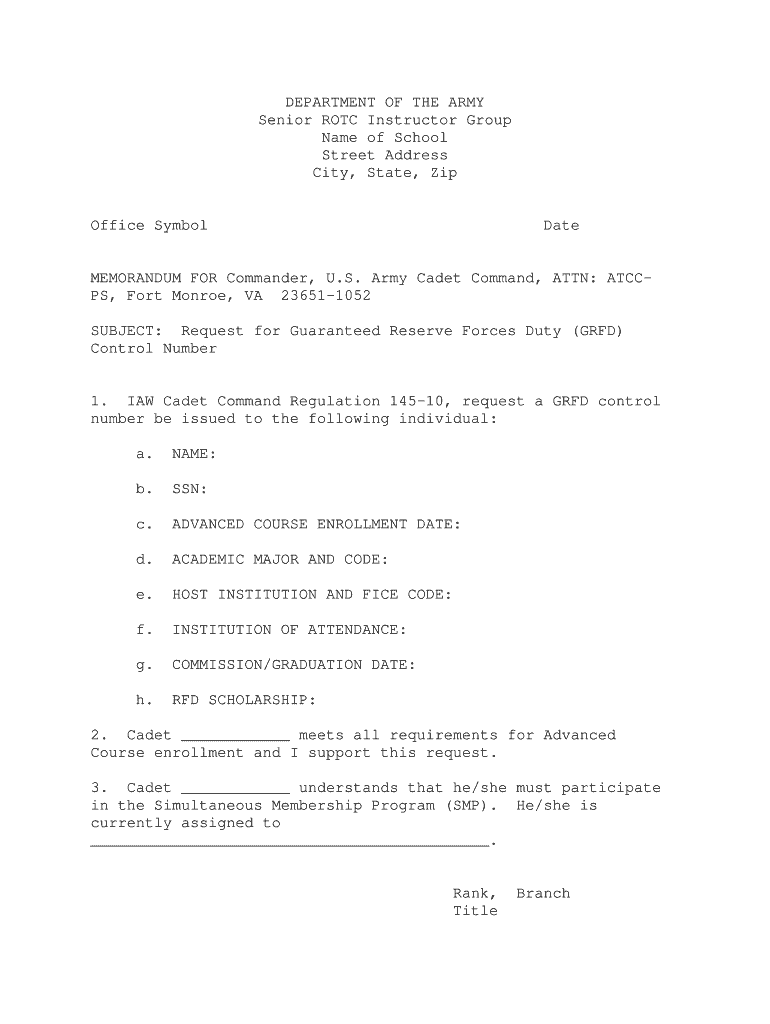 DEPARTMENT OF THE ARMY Senior ROTC Instructor Group Name of School Street Address City, State, Zip Office Symbol Date MEMORANDUM FOR Commander, U.S. Army Cadet Command, ATTN: ATC CPS, Fort Monroe,