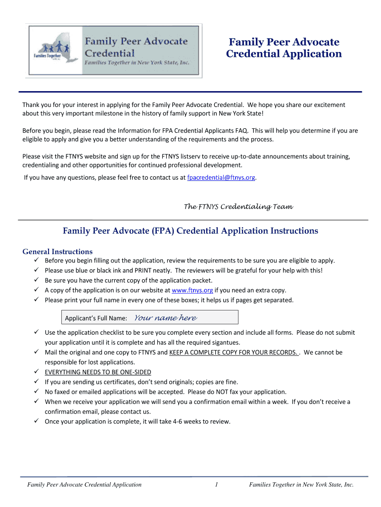 Family Peer Advocate Credential Application Thank you for your interest in applying for the Family Peer Advocate Credential. We hope you share our excitement about this very important milestone in
