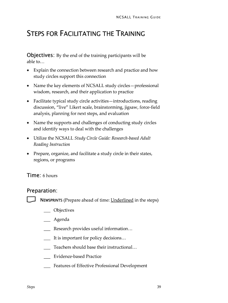 Educators and professionals who are involved in adult education and literacy programs are required to file NCSALL training guide.