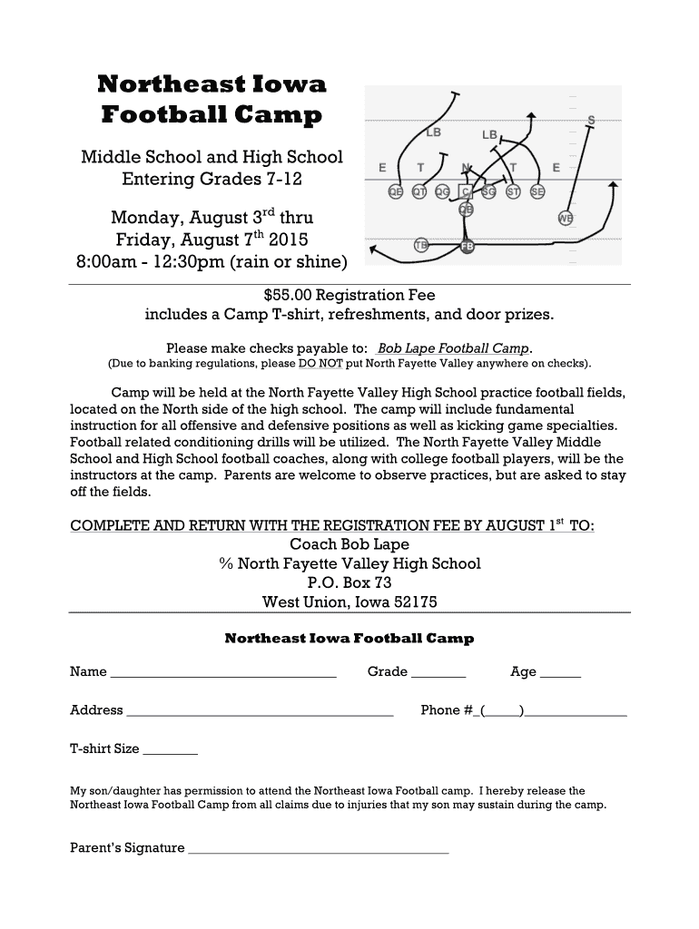 Northeast Iowa Football Camp Middle School and High School Entering Grades 712 Monday, August 3rd through Friday, August 7th 2015 8:00am 12:30pm (rain or shine) $55.00 Registration Fee includes a