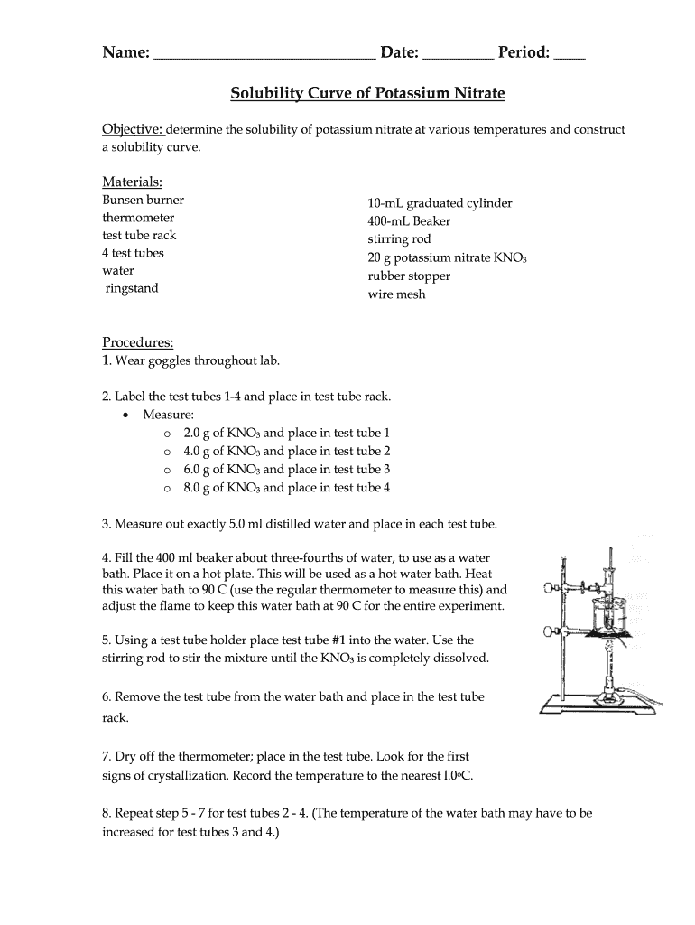 Name: Date: Period: Solubility Curve of Potassium Nitrate Objective: determine the solubility of potassium nitrate at various temperatures and construct a solubility curve. Materials: Bunsen burner