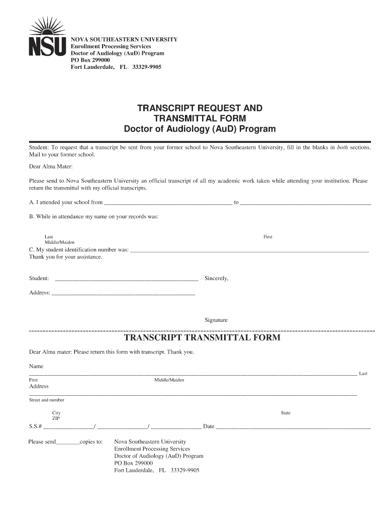 NOVA SOUTHEASTERN UNIVERSITY Enrollment Processing Services Doctor of Audiology (AUD) Program PO Box 299000 Fort Lauderdale, FL 333299905 TRANSCRIPT REQUEST AND TRANSMITTAL FORM Doctor of Audiology