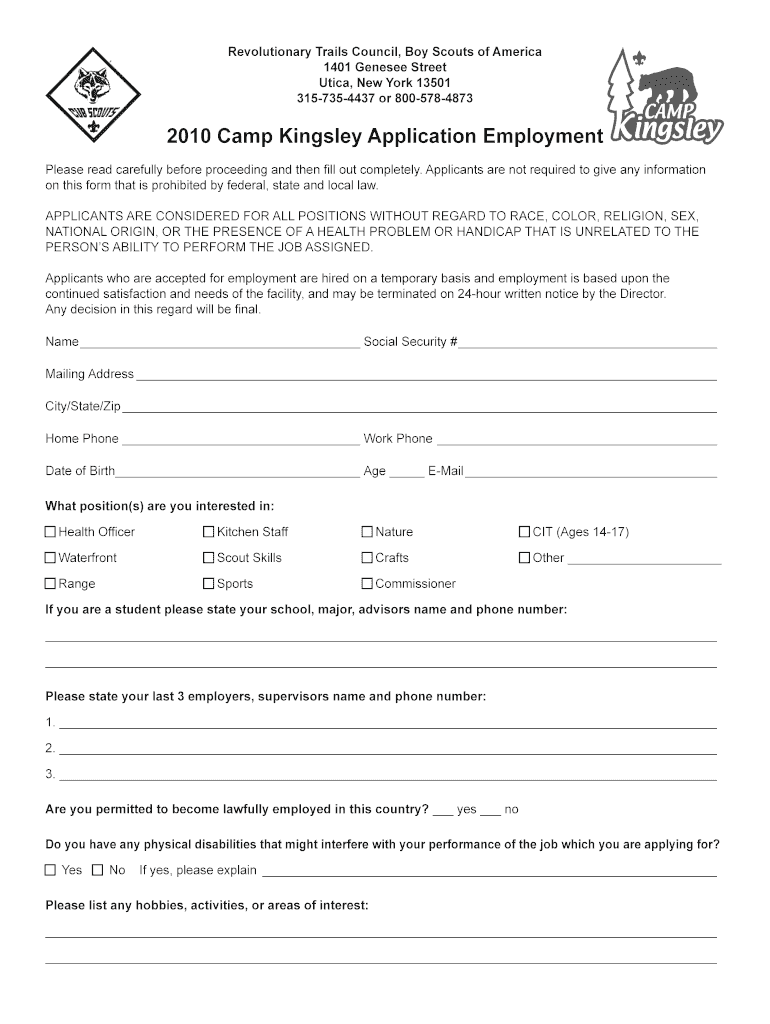 Revolutionary Trails Council, Boy Scouts of America 1401 Geneses Street Utica, New York 13501 3157354437 or 8005784873 2010 Camp Kingsley Application Employment Please read carefully before proceeding