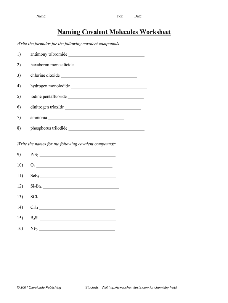 Name: Per: Date: Naming Covalent Molecules Worksheet Write the formulas for the following covalent compounds: 1) antimony bromide 2) hexagon monosilicide 3) chlorine dioxide 4) hydrogen monoiodide