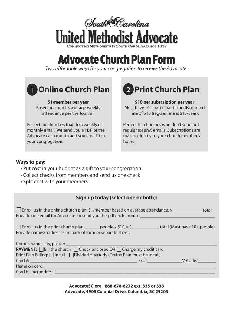 Advocate Church Plan Form Two affordable ways for your congregation to receive the Advocate: 1 Online Church Plan $1/member per year Based on churches average weekly attendance per the Journal. Perfect