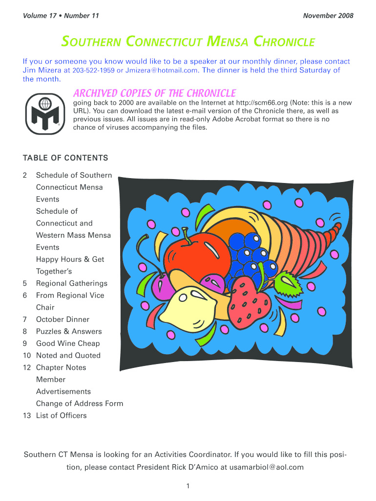 Volume 17 Number 11 November 2008 SOUTHERN CONNECTICUT MENSA CHRONICLE If you or someone you know would like to be a speaker at our monthly dinner, please contact Jim Mineral at 203-522-1959 or Mineral