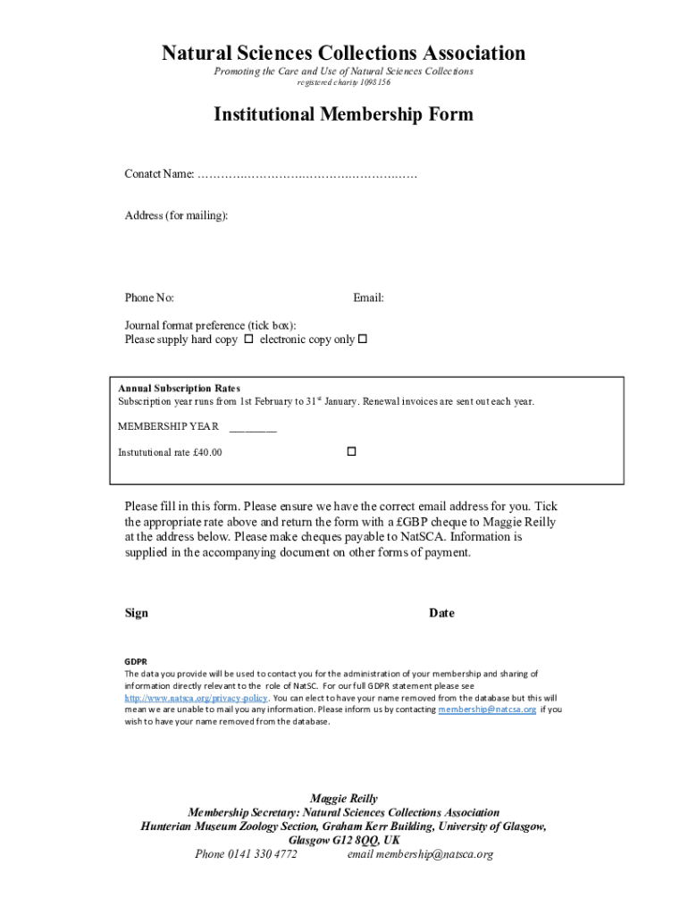 The natsca institutional membership form is a document provided by the Natural Sciences Collections Association (NatSCA) for institutions to apply for membership.