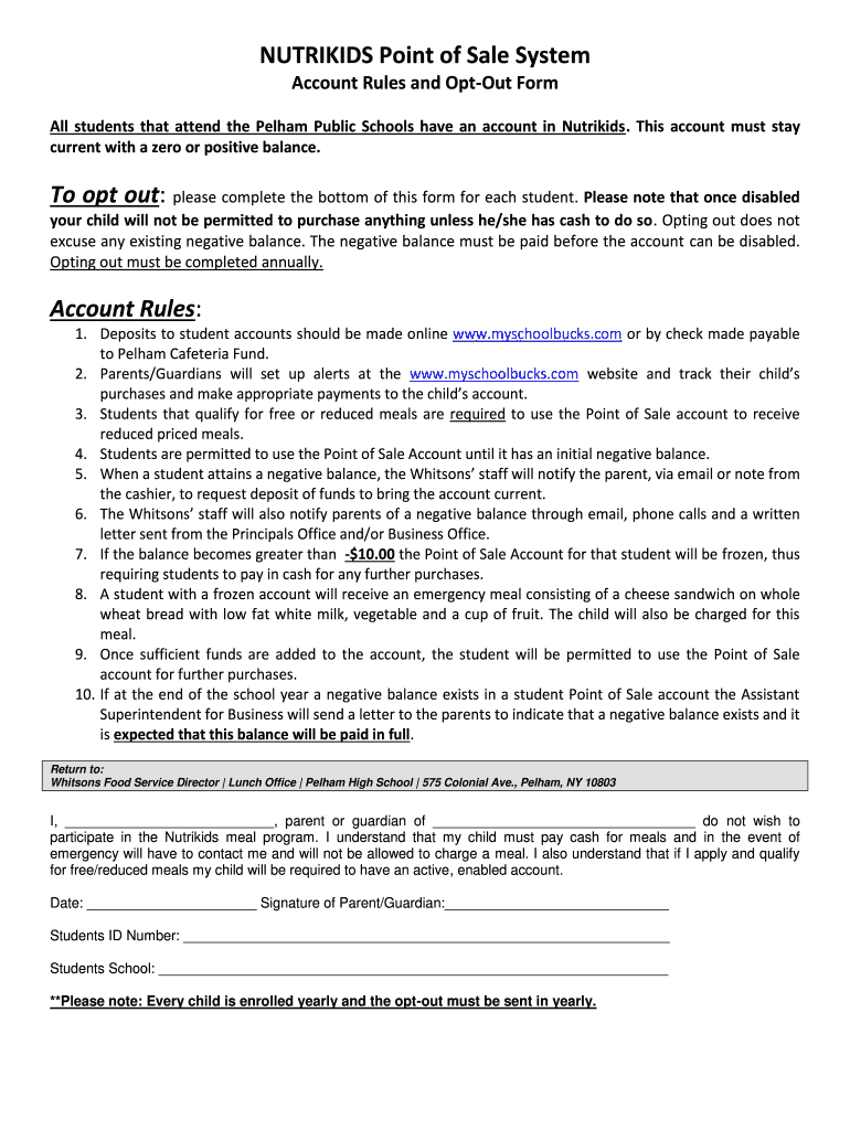 NUTRIENTS Point of Sale System Account Rules and Opt-out Form All students that attend the Pelham Public Schools have an account in Nutrients. This account must stay current with a zero or positive