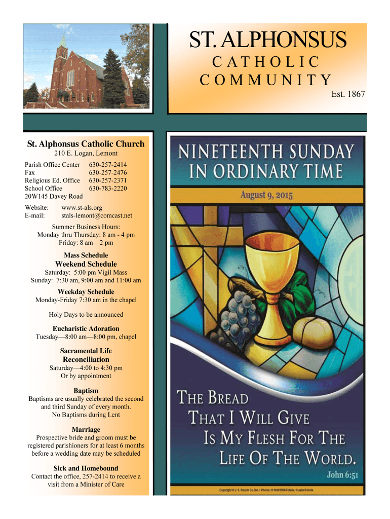 Aug 9, 2015 ... E-mail: stals-lemont Comcast.net. Summer .... website, www.st-als.org, for information on our programs. .... Contact Linda at 630.257.2414 and watch the bulletins for further details.