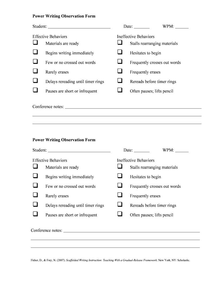 Power Writing Observation Form Student: Effective Behaviors Materials are ready Begins writing immediately Few or no crossed out words Rarely erases Delays rereading until timer rings Pauses are short