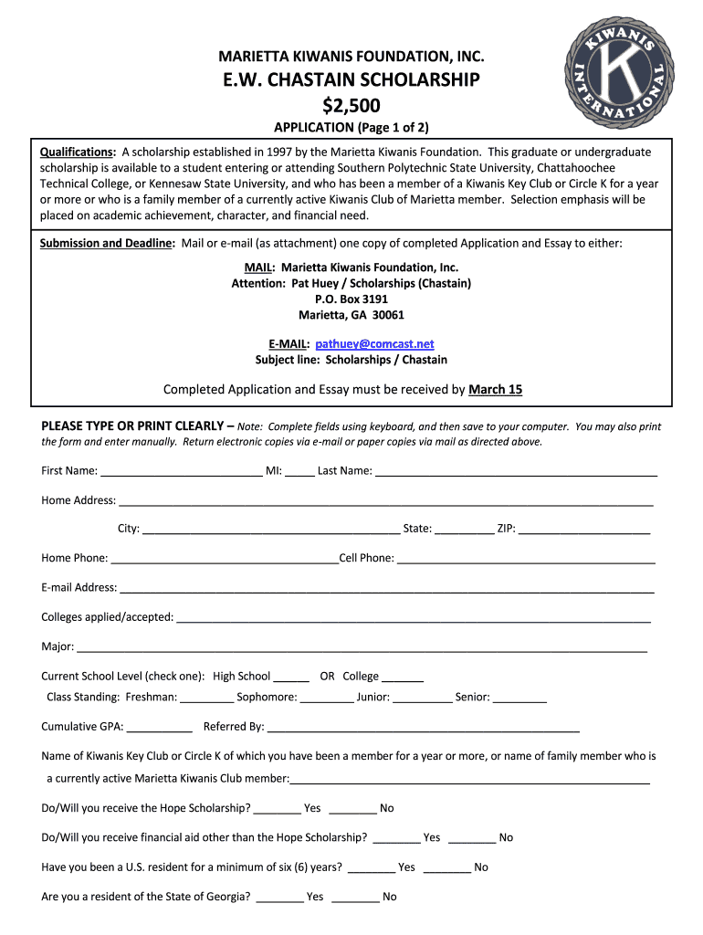 MARIETTA KIWANIS FOUNDATION, INC. E.W. CAPTAIN SCHOLARSHIP $2,500 APPLICATION (Page 1 of 2) Qualifications: A scholarship established in 1997 by the Marietta Kiwanis Foundation. This graduate or undergraduate