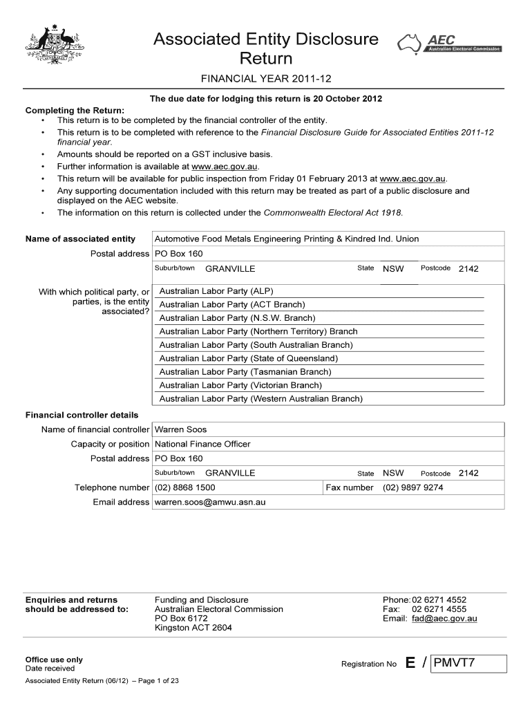 Associated Entity Disclosure Return FINANCIAL YEAR 201112 The due date for lodging this return is 20 October 2012 Completing the Return: This return is to be completed by the financial controller
