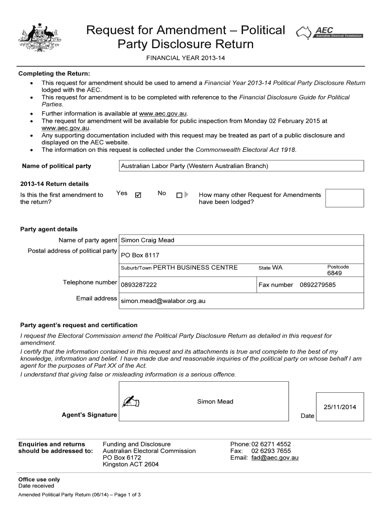 Request for Amendment Political Party Disclosure Return FINANCIAL YEAR 201314 Completing the Return: This request for amendment should be used to amend a Financial Year 201314 Political Party Disclosure