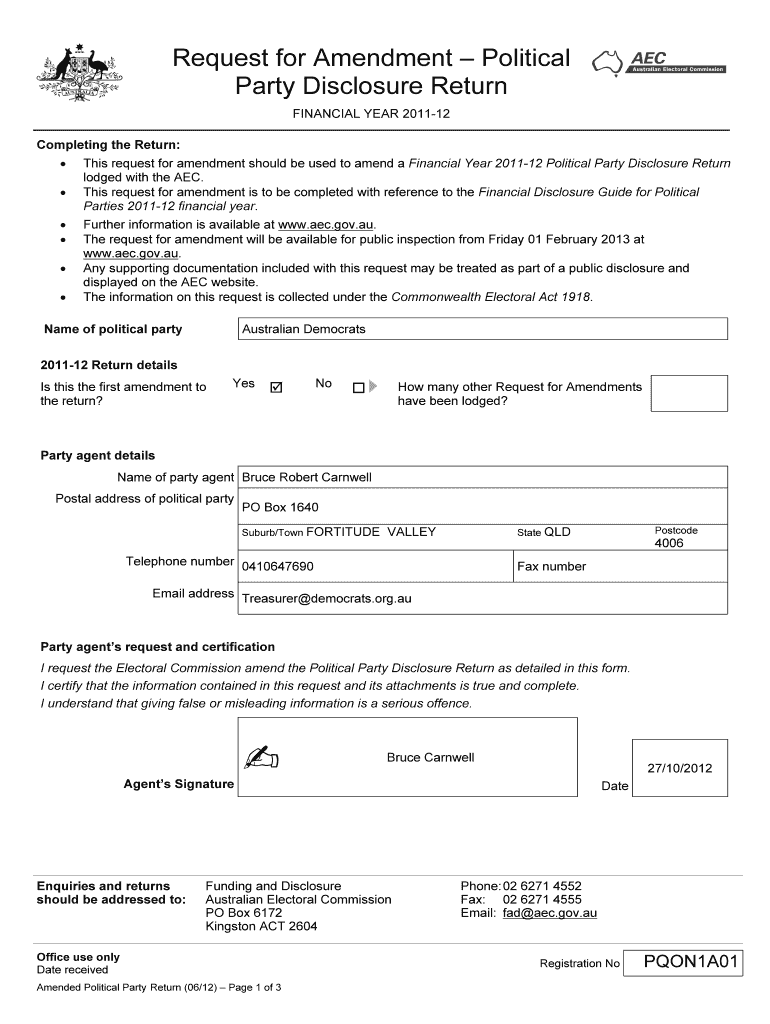 Request for Amendment Political Party Disclosure Return FINANCIAL YEAR 201112 Completing the Return: This request for amendment should be used to amend a Financial Year 201112 Political Party Disclosure