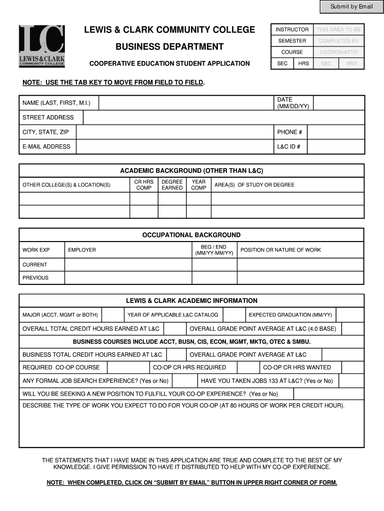 Submit by Email LEWIS & CLARK COMMUNITY COLLEGE INSTRUCTOR THIS AREA TO BE SEMESTER COMPLETED BY COURSE COORDINATOR BUSINESS DEPARTMENT COOPERATIVE EDUCATION STUDENT APPLICATION SEC HRS SEC NOTE: