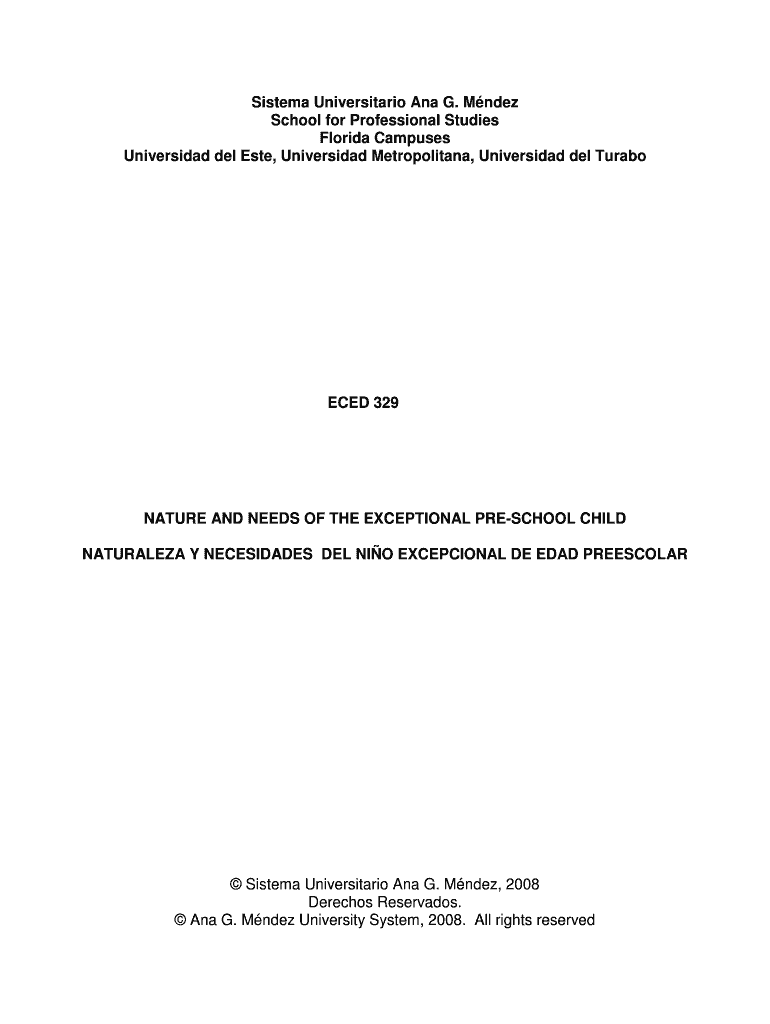 System Universitario Ana G. Mendez School for Professional Studies Florida Campuses Universidad del Ester, University Metropolitan, Universidad del Turbo EYED 329 NATURE AND NEEDS OF THE EXCEPTIONAL