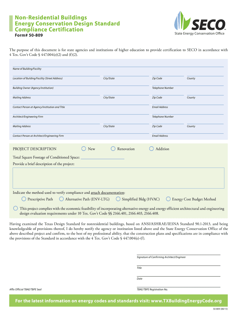 Nonresidential Buildings Energy Conservation Design Standard Compliance Certification Form# 50809 The purpose of this document is for state agencies and institutions of higher education to provide