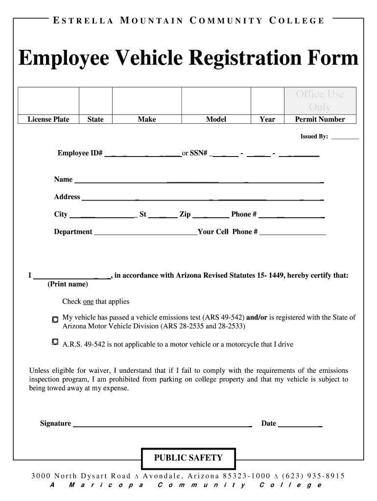 E S T R E L L A M O U N TA I N C O M M U N I T Y C O L L E G E Employee Vehicle Registration Form Office Use Only License Plate State Make Model Year Permit Number Issued By: Employee ID# or SSN#