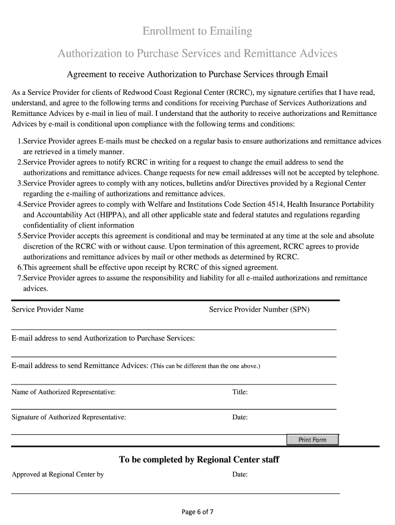 Get the free Enrollment to Emailing Authorization to Purchase Services and - redwoodcoastrc
