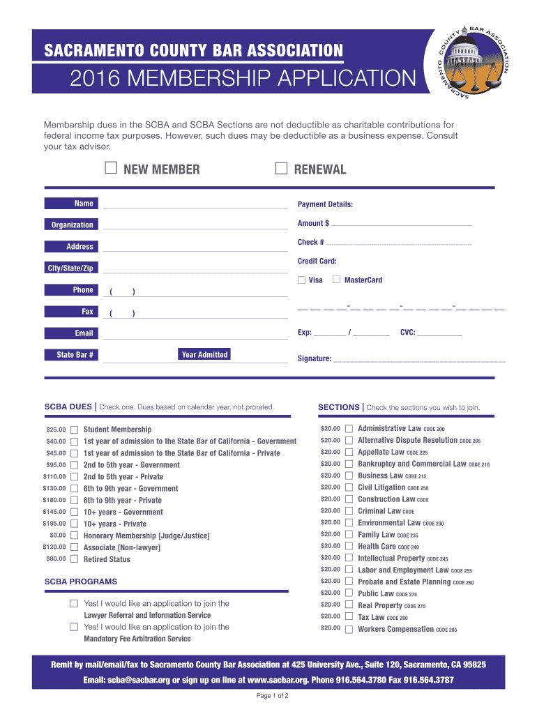 SACRAMENTO COUNTY BAR ASSOCIATION 2016 MEMBERSHIP APPLICATION Membership dues in the CBA and CBA Sections are not deductible as charitable contributions for federal income tax purposes. However, such