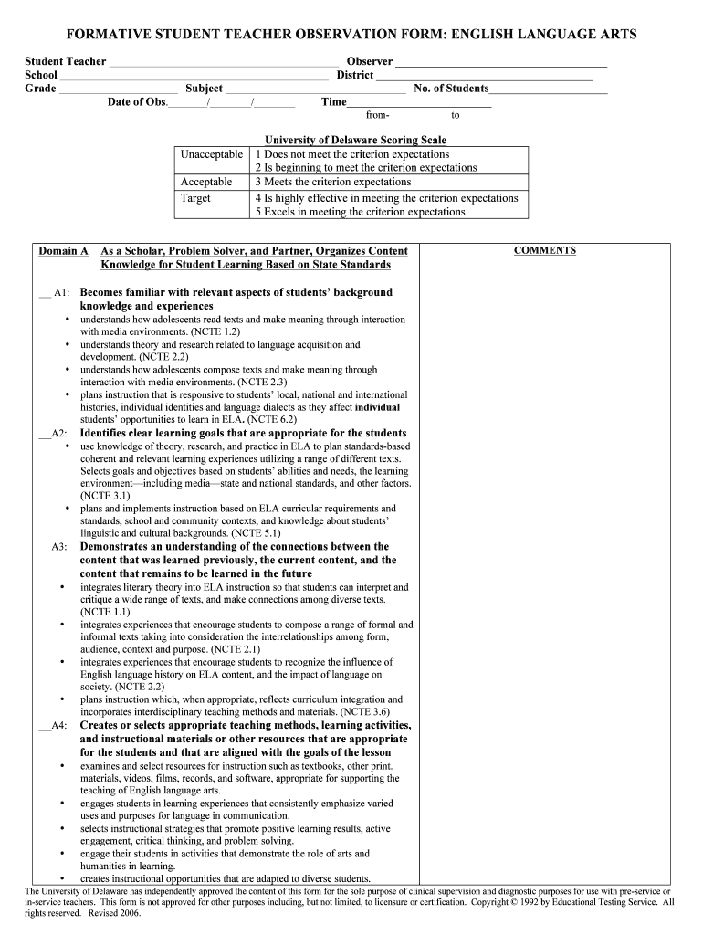 FORMATIVE STUDENT TEACHER OBSERVATION FORM: ENGLISH LANGUAGE ARTS Student Teacher School GradeSubject Date of Obs.//Observer District No. of Students Time fromUnacceptable Acceptable TargetDomain