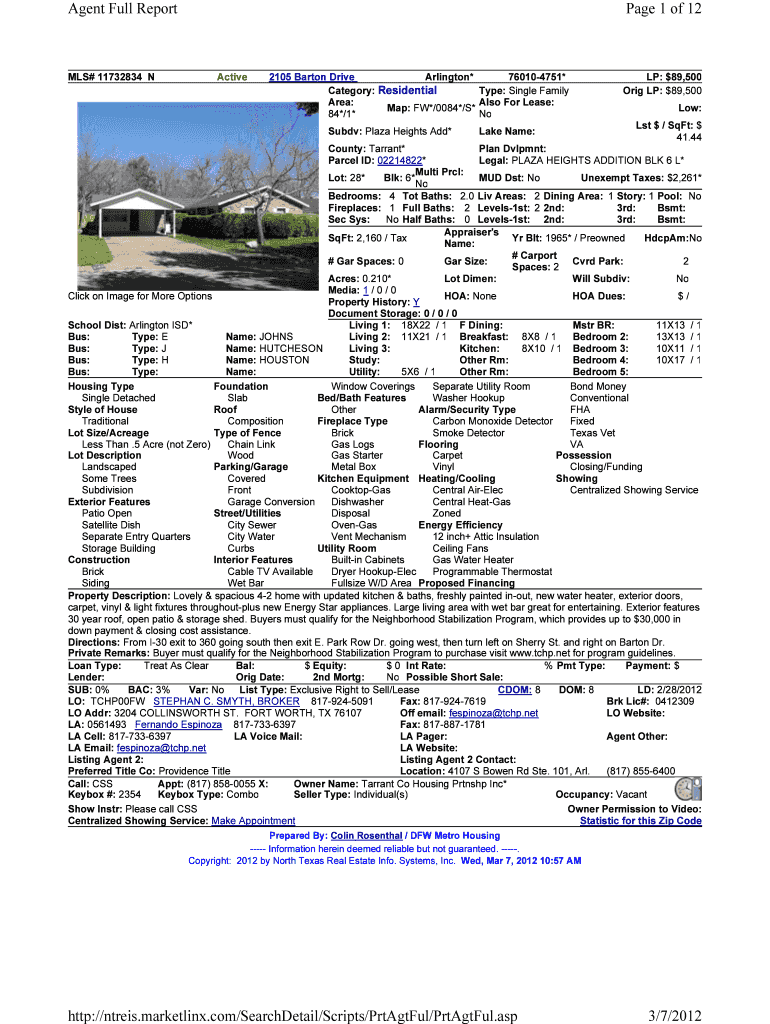 Agent Full Report MLS# 11732834 N Page 1 of 12 Active 2105 Barton Drive Arlington* 760104751* Category: Residential Type: Single Family Area: Also For Lease: Map: FW*/0084*/S 84*/1* No Sub: Plaza
