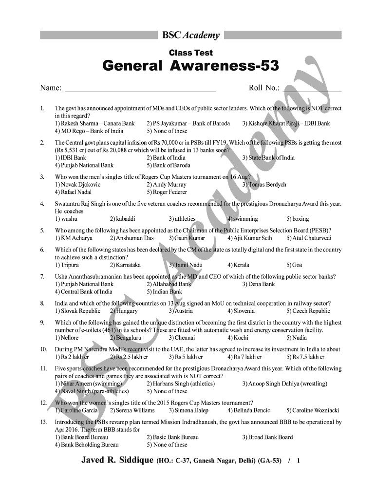 BSC Academy Class Test Name: em y General Awareness53 Roll No.: The govt has announced appointment of MDs and CEOs of public sector lenders. Which of the following is NOT correct in this regard? 1)