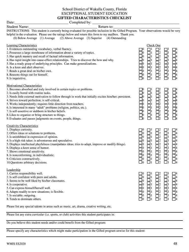 School District of Weibull County, Florida EXCEPTIONAL STUDENT EDUCATION GIFTED CHARACTERISTICS CHECKLIST Date: Completed by: Student Name: Return to: INSTRUCTIONS: This student is currently being