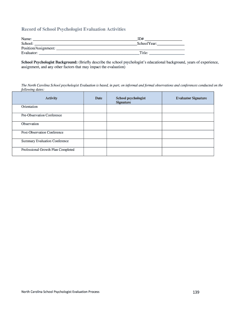 North Carolina School Psychologist Evaluation Process 139 Record of School Psychologist Evaluation Activities Name: ID#