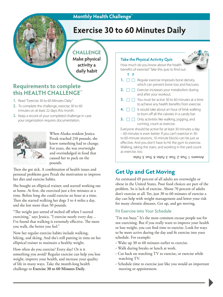 Monthly Health Challenge Exercise 30 to 60 Minutes Daily CHALLENGE Requirements to complete this HEALTH CHALLENGE 1. Read Exercise 30 to 60 Minutes Daily. 2. To complete the challenge, exercise 30