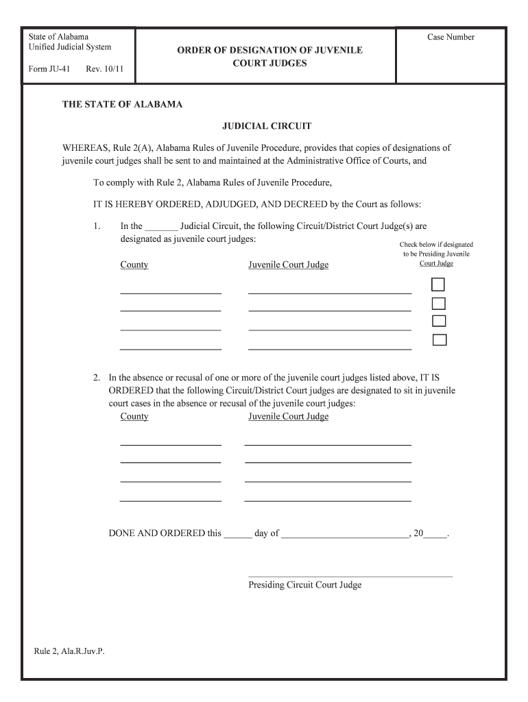 State of Alabama Unified Judicial System Form JU41 Case Number Rev. 10/11 ORDER OF DESIGNATION OF JUVENILE COURT JUDGES THE STATE OF ALABAMA JUDICIAL CIRCUIT WHEREAS, Rule 2(A), Alabama Rules of Juvenile