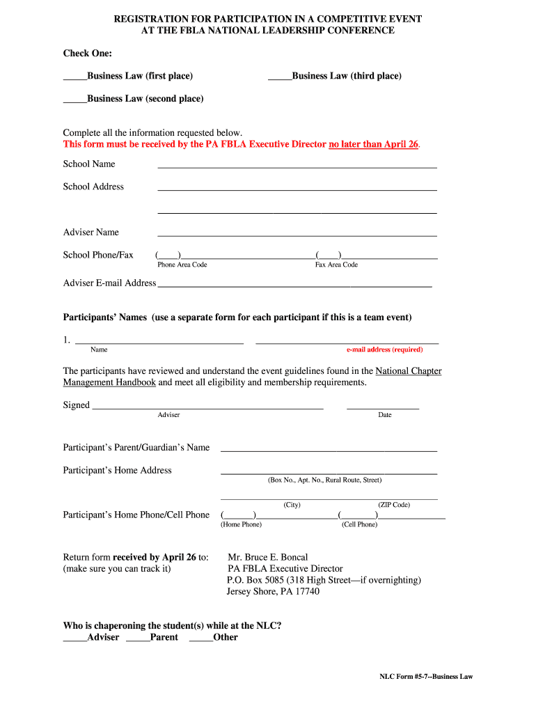 REGISTRATION FOR PARTICIPATION IN A COMPETITIVE EVENT AT THE FBLA NATIONAL LEADERSHIP CONFERENCE Check One: Business Law (first place) Business Law (third place) Business Law (second place) Complete