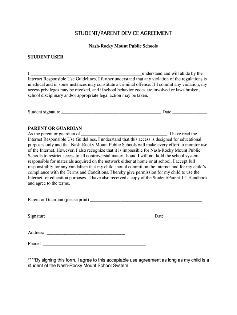 STUDENT/PARENT DEVICE AGREEMENT Nash Rocky Mount Public Schools STUDENT USER I understand and will abide by the Internet Responsible Use Guidelines. I further understand that any violation of the