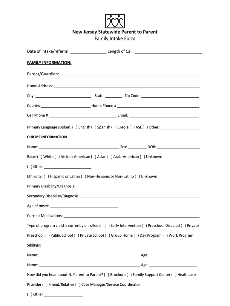 New Jersey Statewide Parent to Parent Family Intake Form Date of intake/referral: Length of Call: FAMILY INFORMATION: