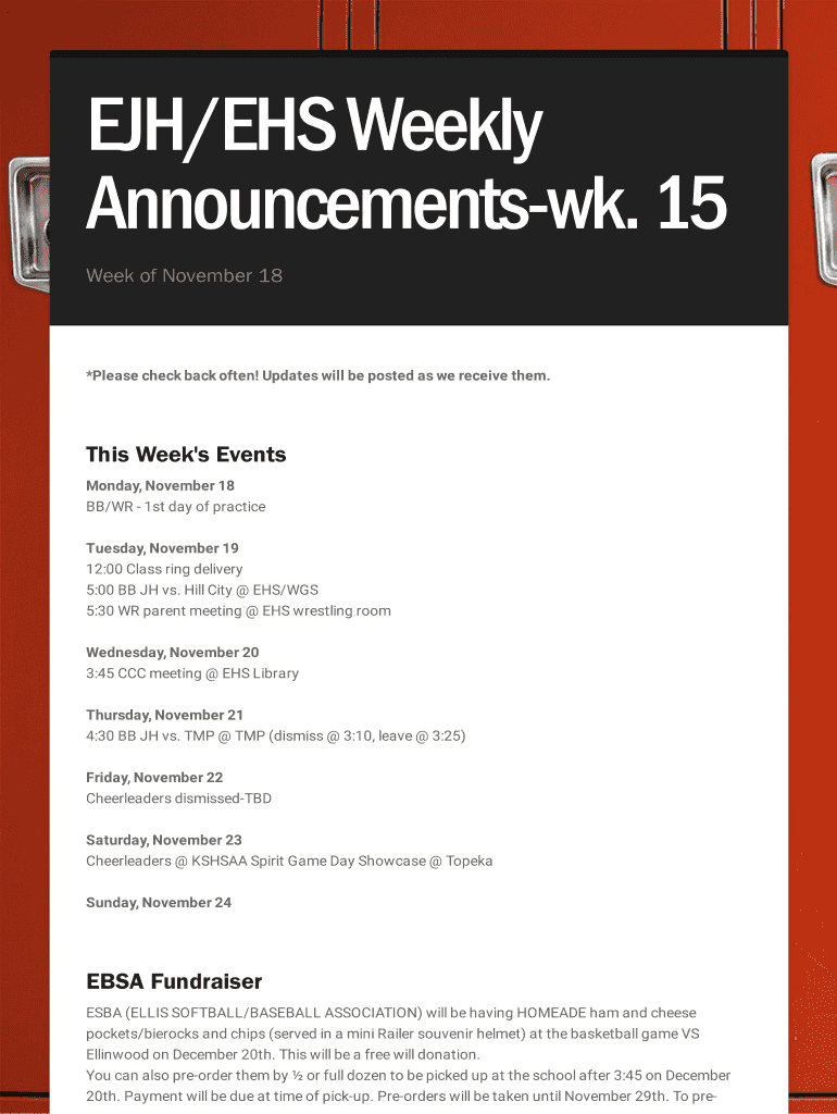 EH/EHS Weekly Announcements wk. 15 Weeks of November 18×Please check back often! Updates will be posted as we receive them. This Week's Events Monday, November 18 BB/WR 1st day of practice Tuesday,