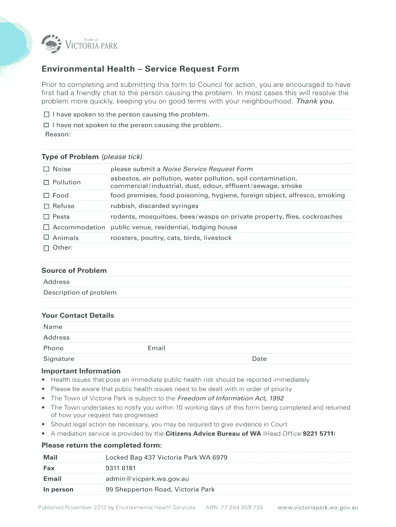 Environmental Health Service Request Form Prior to completing and submitting this form to Council for action, you are encouraged to have first had a friendly chat to the person causing the problem.