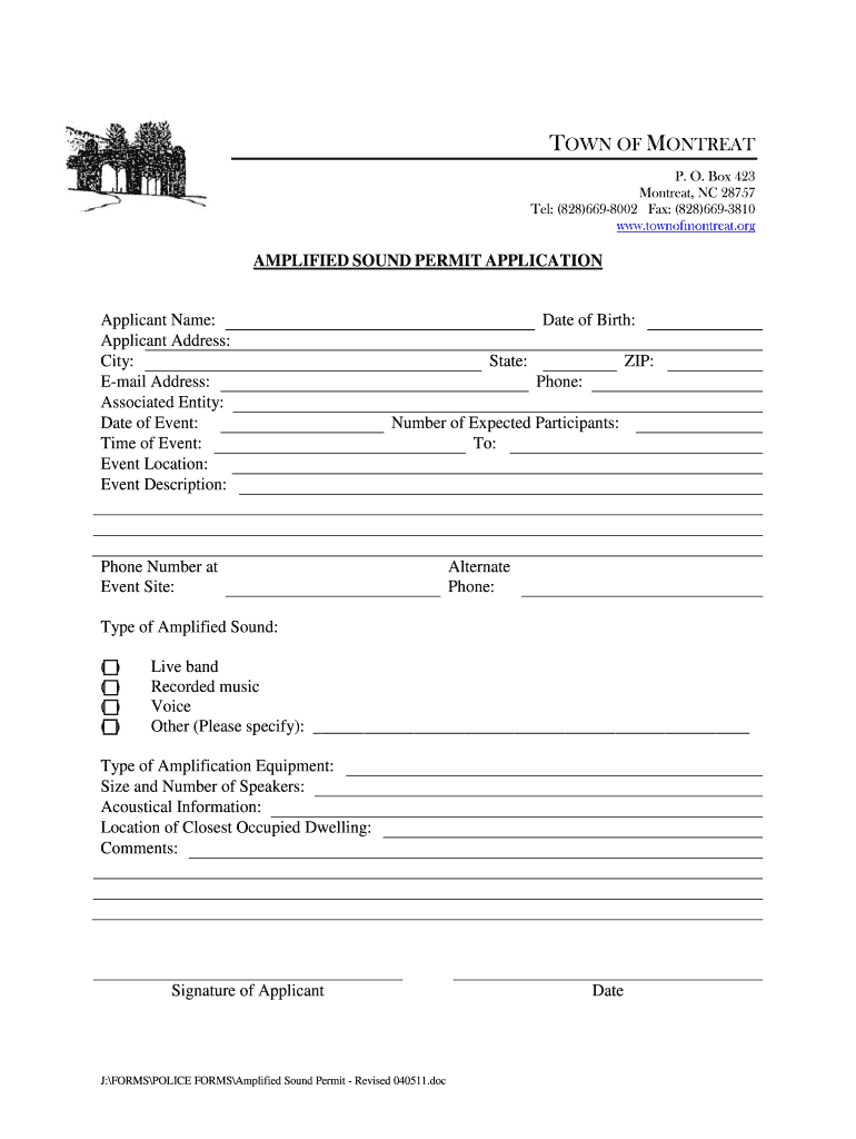 TOWN OF MONTREAL P. O. Box 423 Montreal, NC 28757 Tel: (828)669-8002 Fax: (828)669-3810 www.townofmontreat.org AMPLIFIED SOUND PERMIT APPLICATION Applicant Name: Applicant Address: City: E-mail Address: