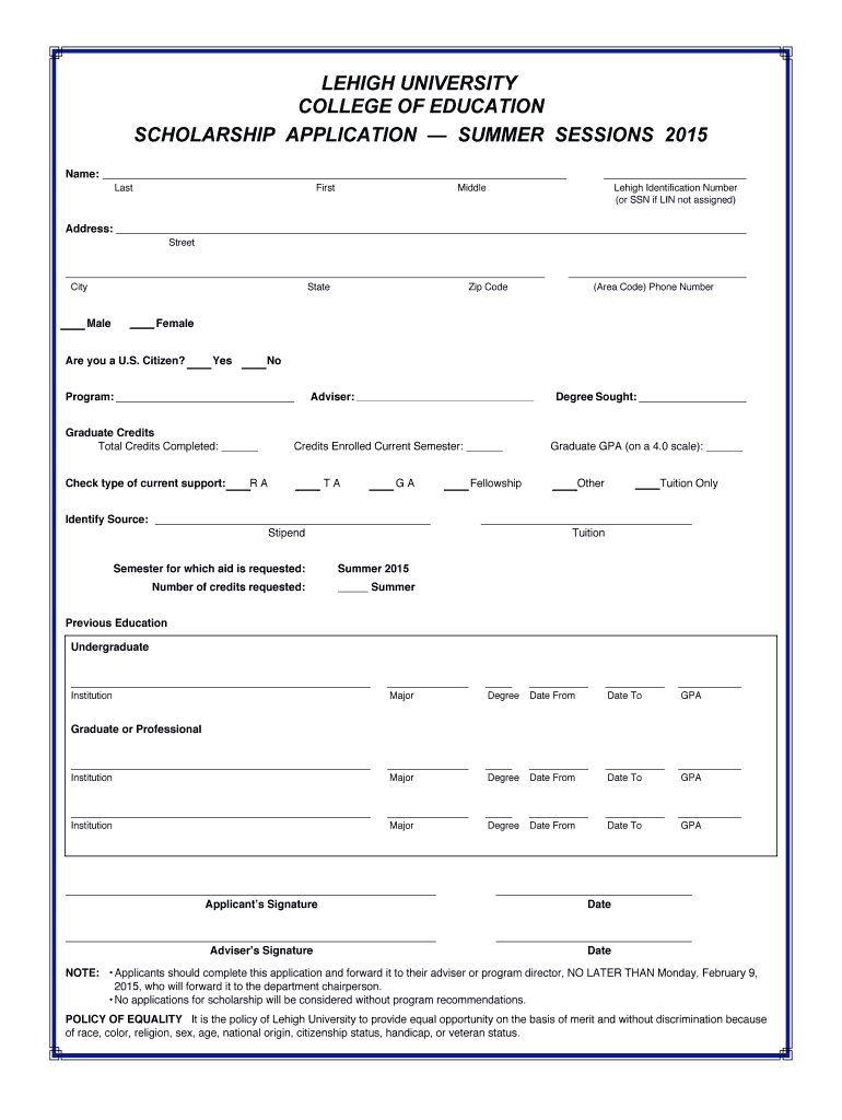 LEIGH UNIVERSITY COLLEGE OF EDUCATION SCHOLARSHIP APPLICATION SUMMER SESSIONS 2015 Name: Last First Middle Leigh Identification Number (or SSN if LIN not assigned) Address: Street City State Male