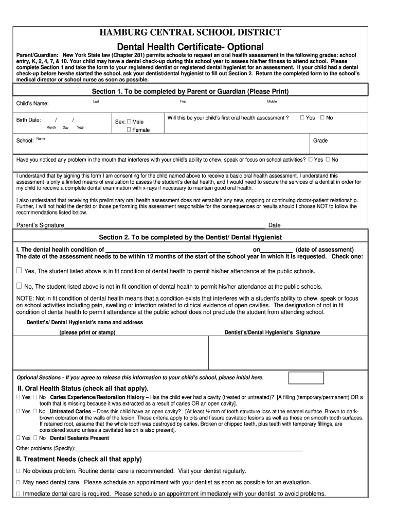 HAMBURG CENTRAL SCHOOL DISTRICT Dental Health Certificate Optional Parent/Guardian: New York State law (Chapter 281) permits schools to request an oral health assessment in the following grades: school