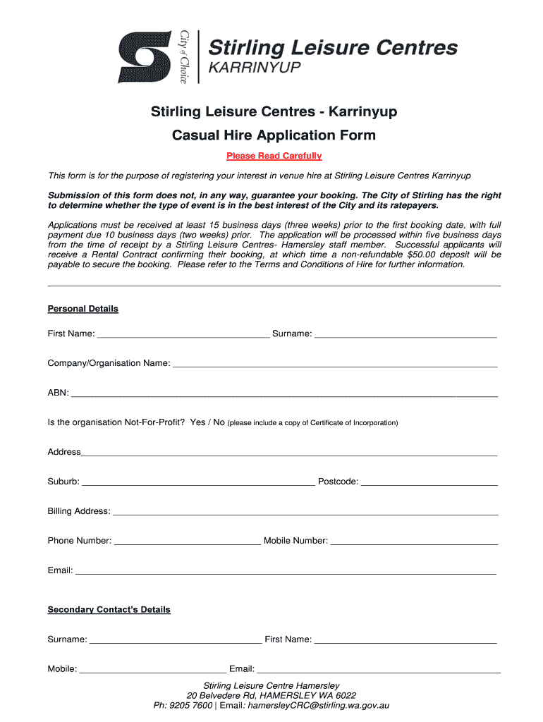 Get the free Stirling Leisure Centres Karrinyup Casual Hire Application Form Please Read Carefull...