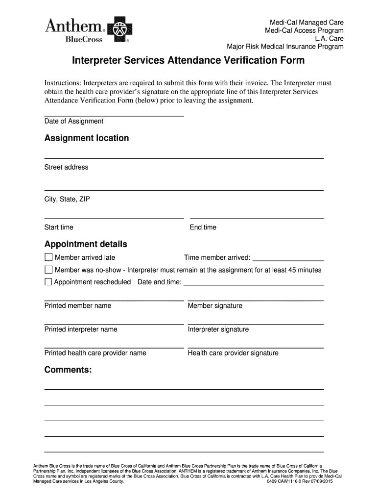 Medical Managed Care Medical Access Program L.A. Care Major Risk Medical Insurance Program Interpreter Services Attendance Verification Form Instructions: Interpreters are required to submit this
