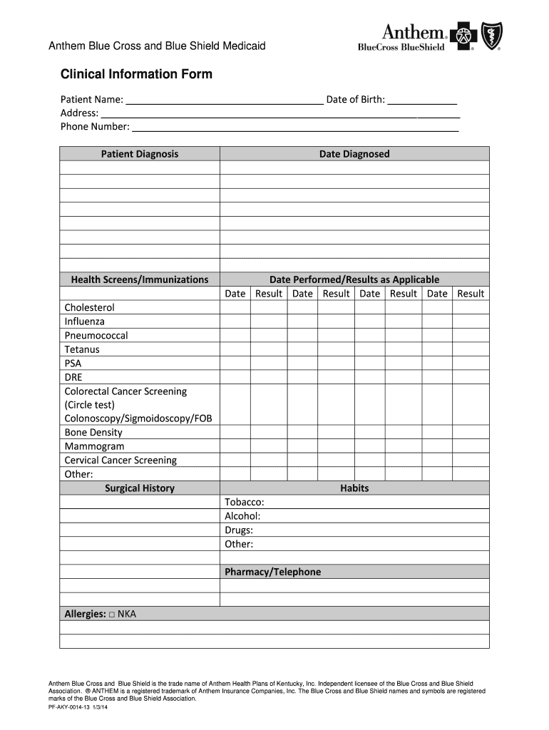 Anthem Blue Cross and Blue Shield Medicaid Clinical Information Form Patient Name: Date of Birth: Address: Phone Number: Patient Diagnosis Date Diagnosed Health Screens/Immunizations Date Performed/Results