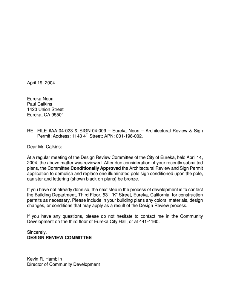 April 19, 2004, Eureka Neon Paul Catkins 1420 Union Street Eureka, CA 95501 RE: FILE #AA04023 & SIGN04009 Eureka Neon Architectural Review & Sign Permit; Address: 1140 4th Street; APN: 001196002.